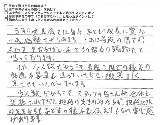 少人数だからこそ、スタッフの皆さんが全体を把握されており、担任の先生のみならず、担任外 の先生からも子どもの様子を伝えてもらい安心感があります。