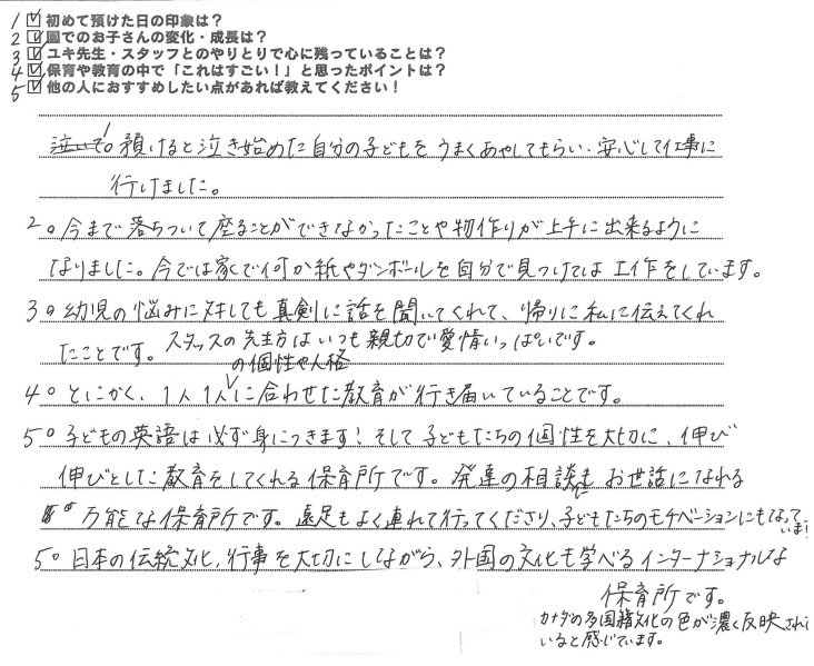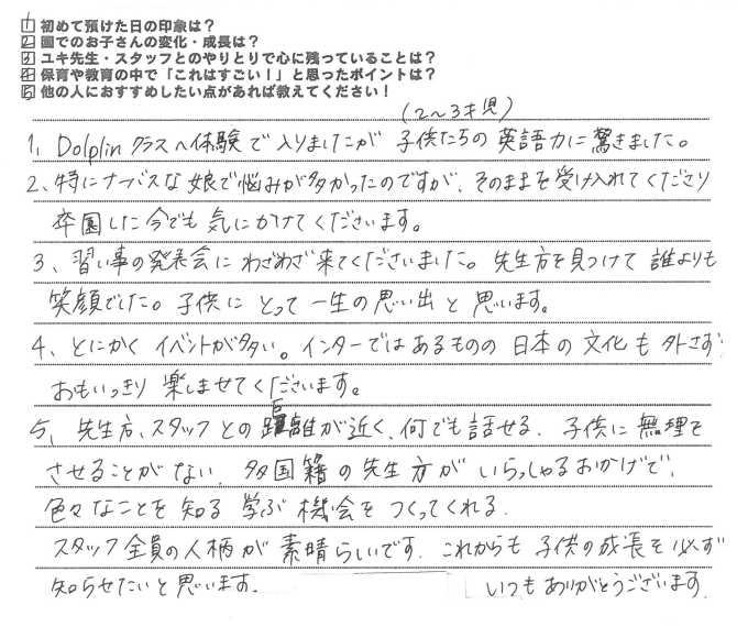 - 幼児の悩みに対しても真剣に話を聞いてくれて、帰りに私に伝えてくれ たことです。スタッフの先生方はいつも親切で愛情いっぱいです。