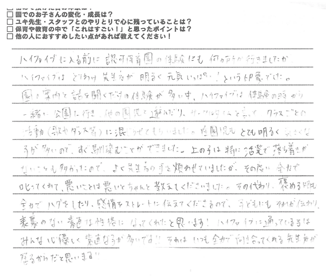 以前の縁では行き渋りが多く、園の先生の対応で悩むことがありましたが、ハイファイブへ来てから毎日楽しく生き生きとしていて朝も笑顔で登園してくれていて親としてはとても安心できるし何より子供本人が「楽しい!」と思えていることがとても嬉しく思います。