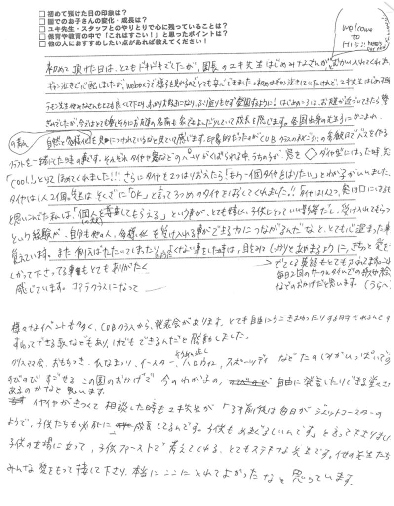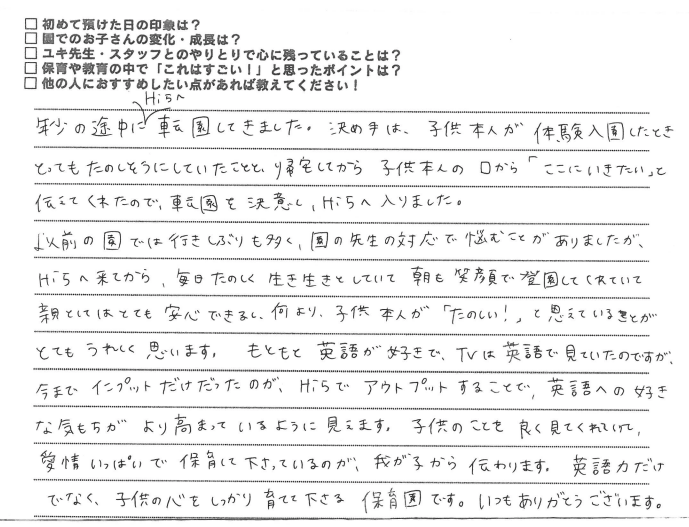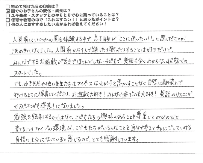 勉強を強制するのではなく、こどもたちの興味のあることを尊重してのびのびと 育てるハイファイブの環境が、こどもたちがいろんなことを自分で考えてチャレンジしていける自信の土台になっていると感じるので、とても感謝しています。