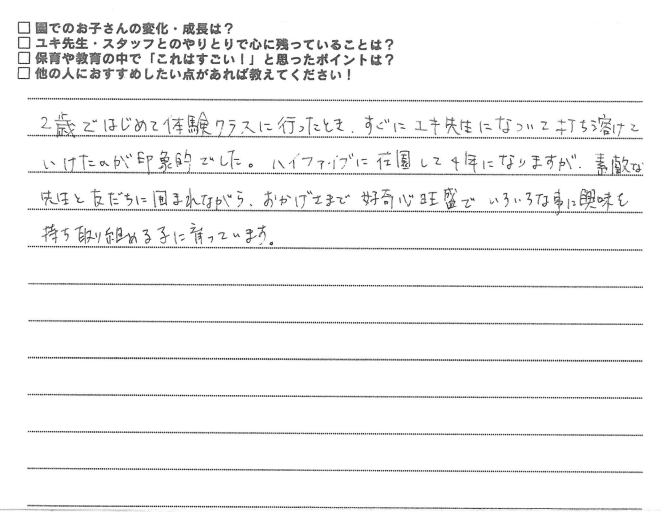 - 2歳ではじめて体験クラスに行ったとき、すぐにユキ先生になついて打ち解けていけたのが印象的でした。